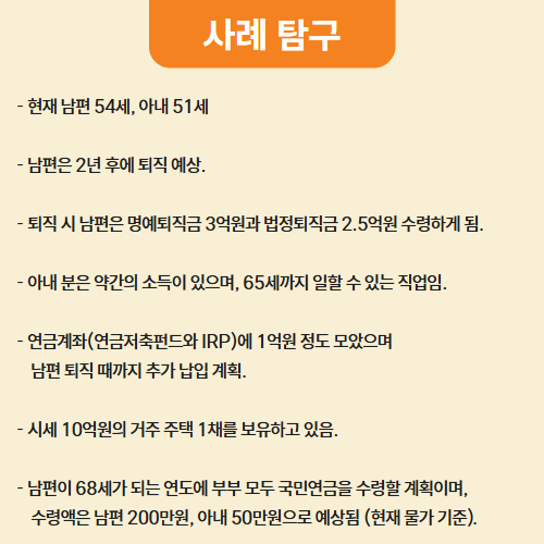 위의 내용을 정리해 보면, 직장 생활을 꾸준히 하여 아파트 한 채가 거의 전 재산인, 우리 주위에서 많이 볼 수 있는 50대의 부부입니다. 뒤늦게 연금계좌 납입을 시작하여서 납입 기간이 짧다 보니 큰 금액을 모으지 못하신 것이 조금 아쉽습니다.