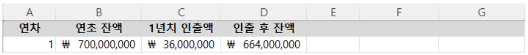 엑셀 프로그램을 실행하고 빈 칸에 아래의 금액 및 수식을 입력합니다. A칸에는 퇴직 후 연차, B칸에는 이 시점의 연금계좌 잔고 7억원, C칸에는 1년 동안 연금계좌에서 빼서 쓸 금액 3,600만원을 입력합니다. D칸에는 B에서 C를 빼는 수식을 입력하여, 인출 후 잔액이 자동으로 계산되도록 합니다. 그러면 C칸에는 잔액 6.64억원이 표시됩니다. |