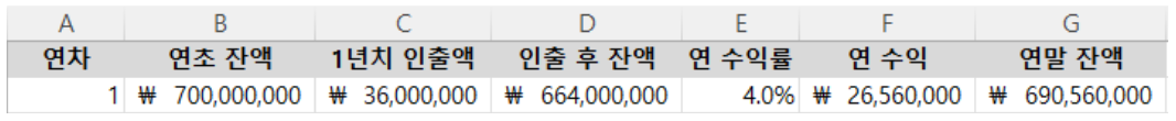 투자하는 금융상품의 종류에 따라 예상되는 수익률이 다르지만, 연 4%의 보수적인 수익률을 낼 것이라고 가정하여 E칸에 입력합니다. 그러면 1년 후에는 6.64억원의 4%인 2,656만원의 수익이 발생할 것입니다. 이 수식을 F칸에 입력하고, 기초 잔액 (D칸)과 1년 수익 (F칸)을 더하는 수식을 G칸에 입력합니다. 이 금액이 퇴직 후 1년이 지난 날의 연금계좌 잔고입니다. |