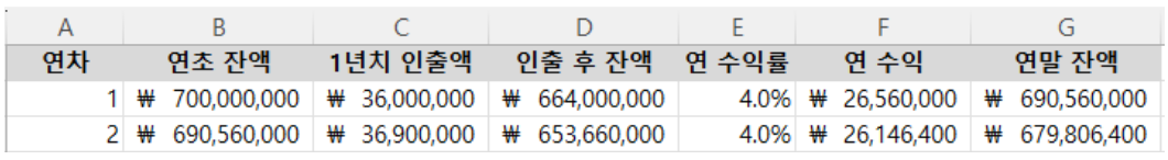 즉 퇴직 시점에 퇴직금과 개인연금을 합쳐서 7억원이 있었는데, 매년 3,600만원에 물가상승률 2.5%를 반영한 금액을 인출하고, 계좌에 남아 있는 자산은 연 4%의 수익을 창출하면 12년 후에는 4.8억원 정도가 남게 됩니다. 실제 인출한 총액은 5억원 정도이지만, 남아 있는 자산이 계속 수익을 창출하여 4.8억원이 남아 있는 것입니다.