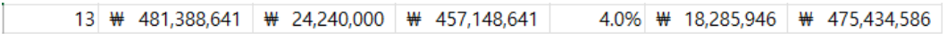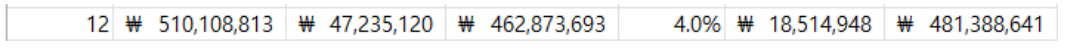 이후의 연도는 2년차를 복사하여 붙이는 것을 반복하면 됩니다. 그러면 연차별 인출금액, 인출 후 잔액, 수익 금액, 연말 잔액이 자동으로 계산되어 표시됩니다. 우리는 국민연금을 수령하기 직전인 12년차의 잔액이 궁금하니, 10번 더 복사와 붙임을 반복하면 됩니다. 그러면 12년차 연도에는 아래의 금액이 계산되어 표시됩니다. |