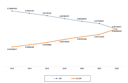 - DB형의 비중이 2012년 73.9%에서 2024년 49.7%로 축소되어 처음으로 과반을 밑돈 반면, DC형은 확대되고 있음 (관련기사)