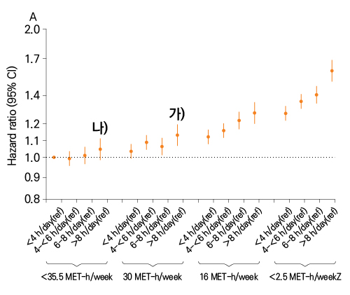 * 매주 약 30 MET-시간의 운동(예: 6 MET 상당의 고강도 운동을 주 5회, 1시간씩)이라고 해도, 매일 8시간 이상의 좌식생활을 하면 전체 사망률은 여전히 높게 나타납니다.