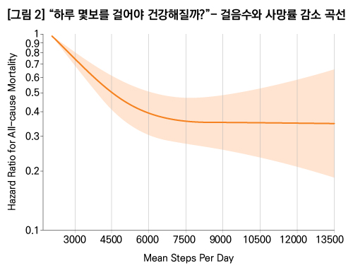 걸음수가 많을수록 사망률이 감소하고, 그 효과는 일정 수준에서 점점 더뎌집니다. |