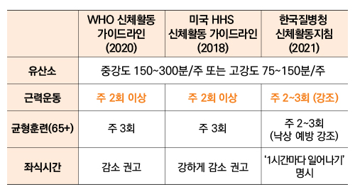 WHO 신체활동 가이드라인 (2020), 미국 HHS에서 발표한 미국 신체활동 가이드라인 (Physical Activity Guidelines for Americans, 2018), 한국 질병관리청 신체활동지침 (2021) 모두 살펴보면, 하루 걸음수에 대해서는 구체적인 수치를 명시하지 않습니다. 대신, “좌식시간”을 줄이고, 1시간마다 1-2분씩 일어나기를 권고하는 정도입니다. 반면, 근력운동에 대해서는 세 기관 모두 예외 없이 “주2회 이상 반드시 할 것”을 강조합니다. 이는 매우 명확한 메시지입니다. |