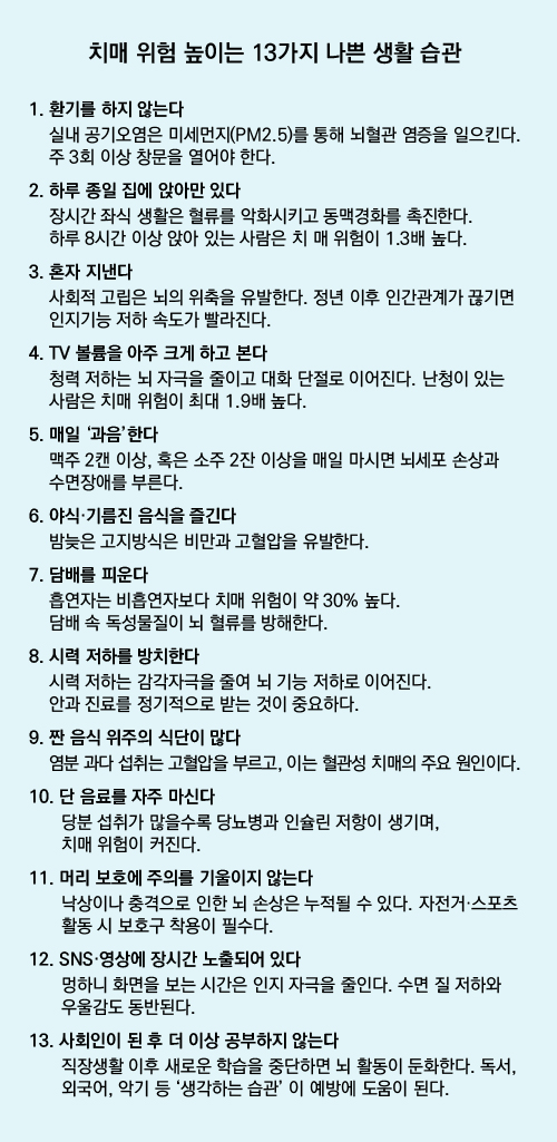 인지적인 자극이 적은 것도 치매 위험을 높인다고 합니다. 사회인이 된 이후로 공부를 하지 않고 머리를 쓰는 일을 멈추면 뇌에 자극이 줄어들기 때문입니다.